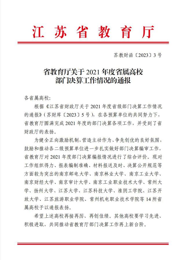 近日,省教育厅印发《关于2021年度省属高校部门决算工作情况的通报》(苏教财函〔2023〕3号),我校再次被评为“省属高校部门决算先进单位”。