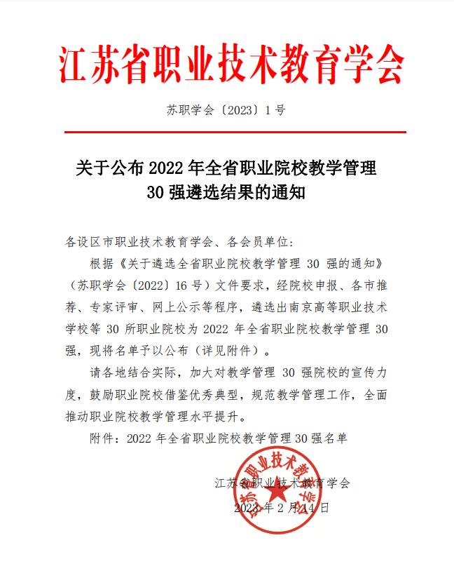 2月14日,江苏省职业技术教育学会公布了2022年全省职业院校教学管理30 强遴选结果,我校成功入选30强名单。