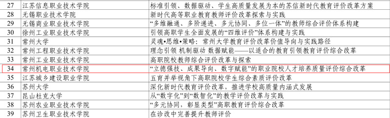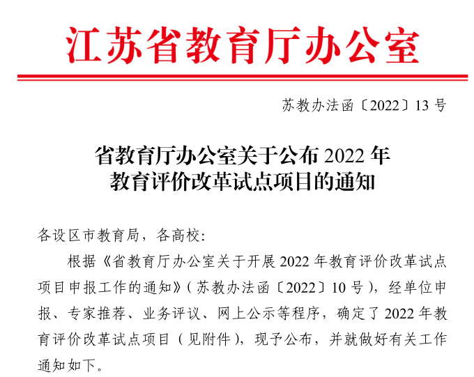 近日,省教育厅发布《省教育厅办公室关于公布2022年教育评价改革试点项目的通知》,我校《“立德强技、成果导向、数字赋能”的职业院校人才培养质量评价综合改革》入选2022年江苏省教育评价改革试点项目。