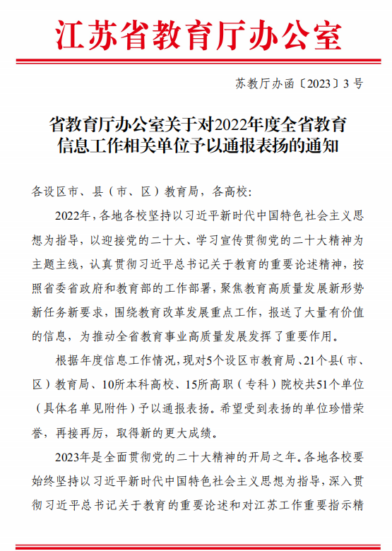 近日,省教育厅办公室发布《关于对2022年度全省教育信息工作相关单位予以通报表扬的通知》,对全省5个设区市教育局、21 个县(市、区)教育局、10所本科高校、15所高职(专科)院校共51个单位进行通报表扬,我校连续三年荣获“全省教育信息工作表扬单位”称号。