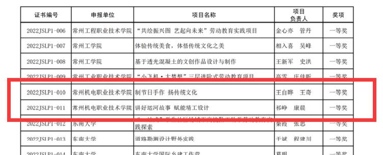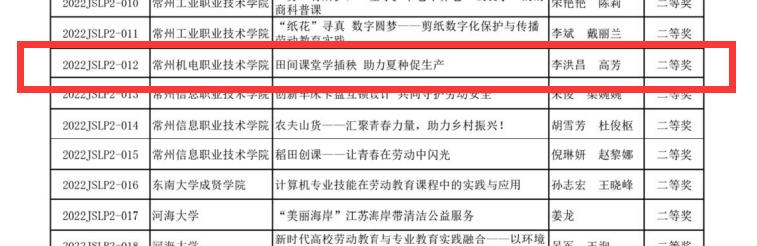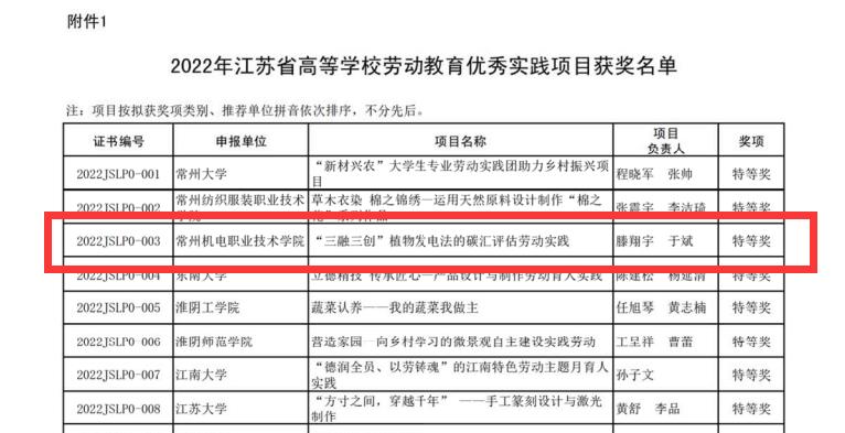 3月3日,江苏省高等教育学会公布了2022年江苏省高等学校劳动教育优秀实践项目评选结果,我校获特等奖1项,一等奖2项,二等奖1项,学校获优秀组织奖。