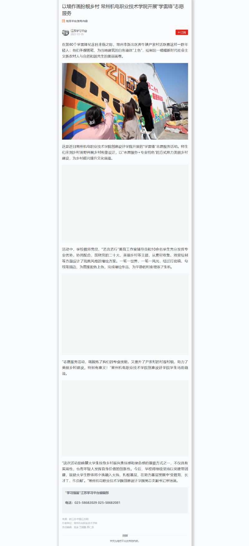 这是近日常州机电职业技术学院创意设计学院开展的“学雷锋”志愿服务活动。师生们来到乡村田野开展乡村形象设计,以“志愿服务+专业特色”的方式助力美丽乡村建设,为乡村振兴提升文化底蕴。