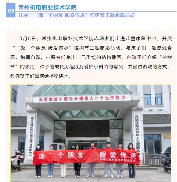 3月8日,常州机电职业技术学院志愿者们走进儿童康复中心,开展“‘浇’个朋友 暖爱传承”植树节主题志愿活动,与孩子们一起感受春意,触摸自然。志愿者们拿出自己手绘的植物插画,向孩子们介绍“植树节”的来历、种子的成长历程以及爱护小树苗的常识,并通过游戏的方式,教导孩子们如何给植物浇水。