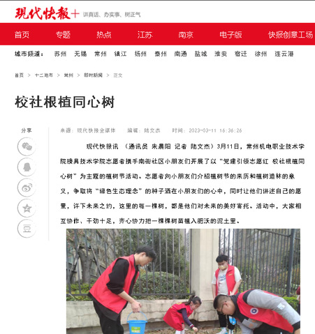 现代快报讯 (通讯员 朱晨阳 记者 陆文杰)311日,常州机电职业技术学院模具技术学院志愿者携手南街社区小朋友们开展了以“党建引领志愿红 校社根植同心树”为主题的植树节活动。志愿者向小朋友们介绍植树节的来历和植树造林的意义,争取将“绿色生态理念”的种子洒在小朋友们的心中,同时让他们讲述自己的愿景,许下未来之约,这里的每一棵树,都是他们对未来的美好寄托。活动中,大家相互协作、干劲十足,齐心协力把一棵棵树苗植入肥沃的泥土里。