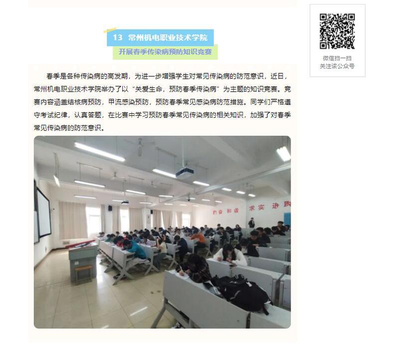 春季是各种传染病的高发期,为进一步增强学生对常见传染病的防范意识,近日,常州机电职业技术学院举办了以“关爱生命,预防春季传染病”为主题的知识竞赛。竞赛内容涵盖结核病预防,甲流感染预防,预防春季常见感染病防范措施。同学们严格遵守考试纪律,认真答题,在比赛中学习预防春季常见传染病的相关知识,加强了对春季常见传染病的防范意识。