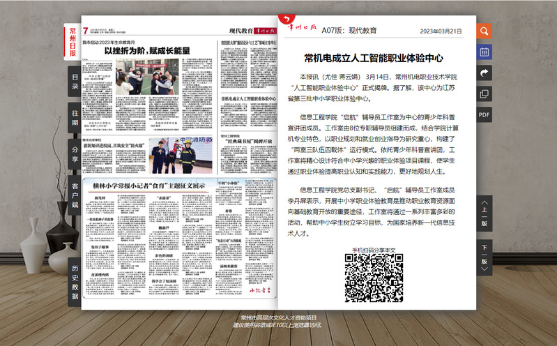 本报讯(尤佳蒋云娟)3月14日,常州机电职业技术学院“人工智能职业体验中心”正式揭牌。据了解,该中心为江苏省第三批中小学职业体验中心。