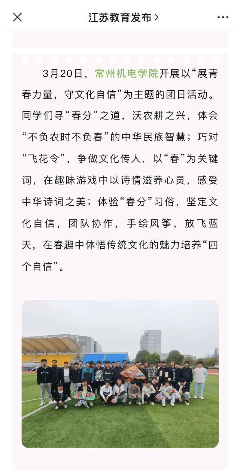 3月20日,常州机电学院开展以“展青春力量,守文化自信”为主题的团日活动。同学们寻“春分”之道,沃农耕之兴,体会“不负农时不负春”的中华民族智慧;巧对“飞花令”,争做文化传人,以“春”为关键词,在趣味游戏中以诗情滋养心灵,感受中华诗词之美;体验“春分”习俗,坚定文化自信,团队协作,手绘风筝,放飞蓝天,在春趣中体悟传统文化的魅力培养“四个自信”。