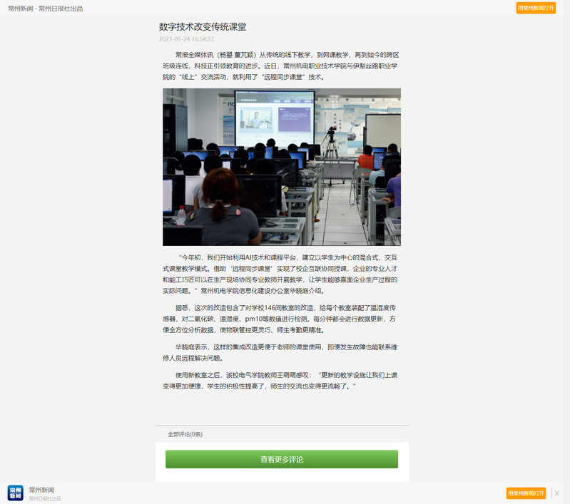 “今年初,我们开始利用AI技术和课程平台,建立以学生为中心的混合式、交互式课堂教学模式。借助‘远程同步课堂’实现了校企互联协同授课,企业的专业人才和能工巧匠可以在生产现场协同专业教师开展教学,让学生能够直面企业生产过程的实际问题。”常州机电学院信息化建设办公室华晓庭介绍。