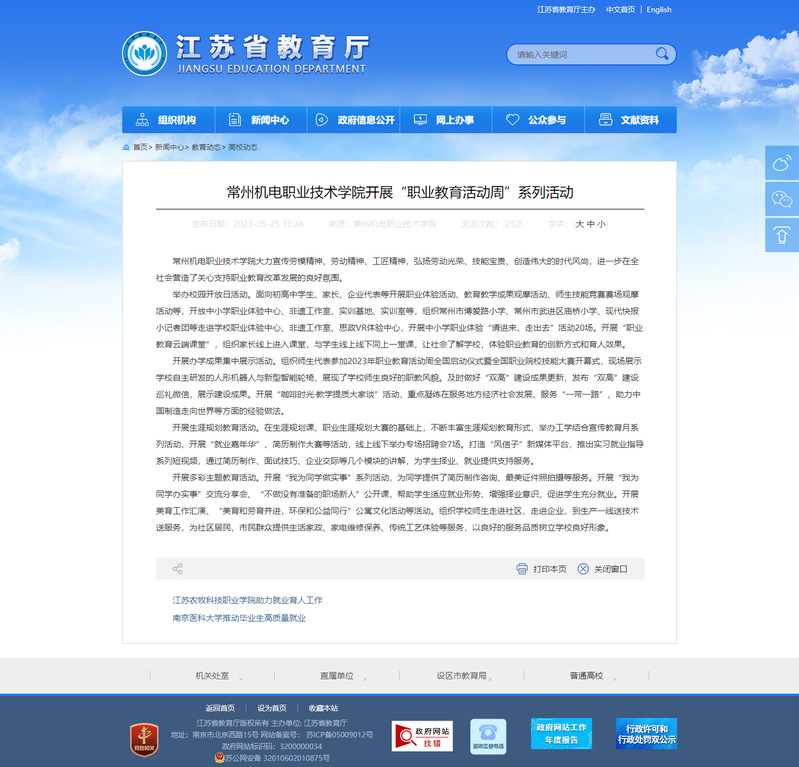 常州机电职业技术学院大力宣传劳模精神、劳动精神、工匠精神,弘扬劳动光荣、技能宝贵、创造伟大的时代风尚,进一步在全社会营造了关心支持职业教育改革发展的良好氛围。