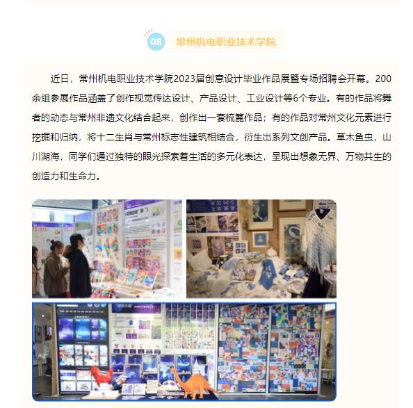 近日,常州机电职业技术学院2023届创意设计毕业作品展暨专场招聘会开幕。200余组参展作品涵盖了创作视觉传达设计、产品设计、工业设计等6个专业。有的作品将舞者的动态与常州非遗文化结合起来,创作出一套梳篦作品;有的作品对常州文化元素进行挖掘和归纳,将十二生肖与常州标志性建筑相结合,衍生出系列文创产品。草木鱼虫,山川湖海,同学们通过独特的眼光探索着生活的多元化表达,呈现出想象无界、万物共生的创造力和生命力。