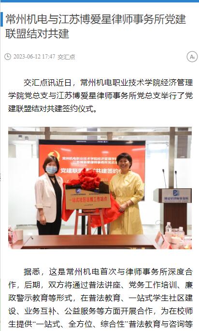 交汇点讯近日,常州机电职业技术学院经济管理学院党总支与江苏博爱星律师事务所党总支举行了党建联盟结对共建签约仪式。