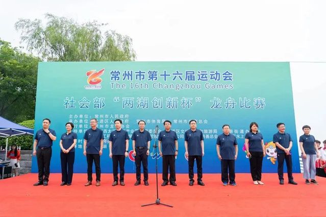 6月20日,常州市第十六届运动会社会部“两湖创新杯”龙舟比赛在西太湖水上运动中心举行。此次比赛由常州市人民政府主办,武进区人民政府、常州市体育局以及常州市体育总会承办,常州市龙舟协会具体执行。常州市人民政府副市长蒋鹏举、常州市人民政府副秘书长陈峰、常州市体育局局长杜吉宾、常州市体育局二级调研员魏继斌等领导参加了比赛开幕式。