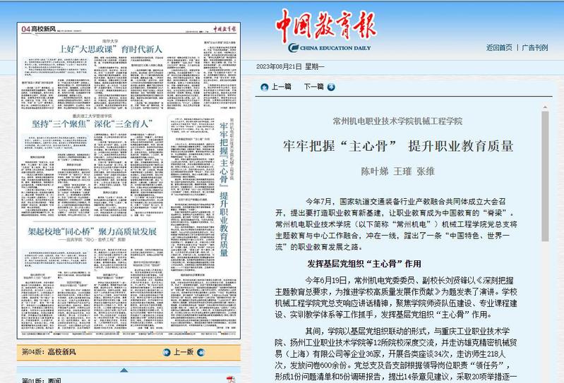 今年7月,国家轨道交通装备行业产教融合共同体成立大会召开,提出要打造职业教育新基建,让职业教育成为中国教育的“脊梁”。常州机电职业技术学院(以下简称“常州机电”)机械工程学院党总支将主题教育与中心工作融合,冲在一线,蹚出了一条“中国特色、世界一流”的职业教育发展之路。