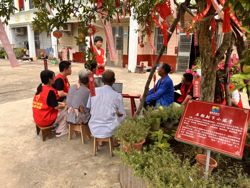 实践团成员在城西回民村象征民族团结的石榴树下,为回民村留守老人讲述中国共产党领导下的中华民族团结一家亲的红色故事,宣讲我国的民族团结政策和少数民族学生资助政策,普及《中华人民共和国民法典》主要条款、《八段锦》养生功法、新能源汽车和农业种植等知识。
