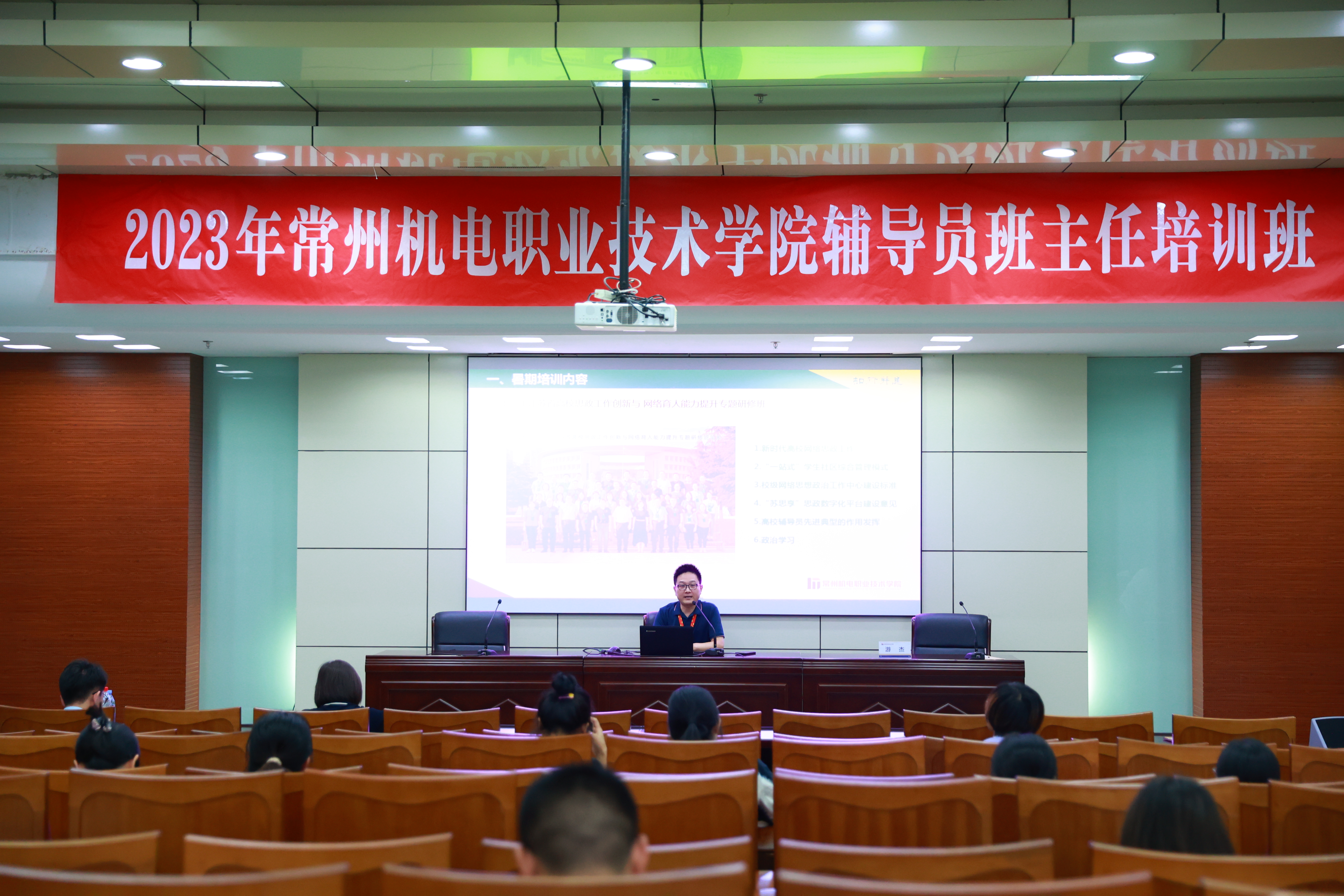 本次培训以辅导员班主任综合能力提升为主线,坚持“搭建平台,学思结合,突出实效”,邀请了2023年江苏省最美辅导员——扬州大学的左红梅老师、江苏省心理名师工作室负责人——南京师范大学的曹加平教授、全国辅导员年度人物(提名)——我校在学生工作取得卓越成绩的王奇老师,围绕新时代思政教育工作者能力培养、家校沟通、学生工作中的情感教育等专题进行了培训。学生工作处曾李红、李玲玲、贾明阳分别就资助、心理、公寓进行了业务雷点分析,培训紧扣实际,内容丰富。