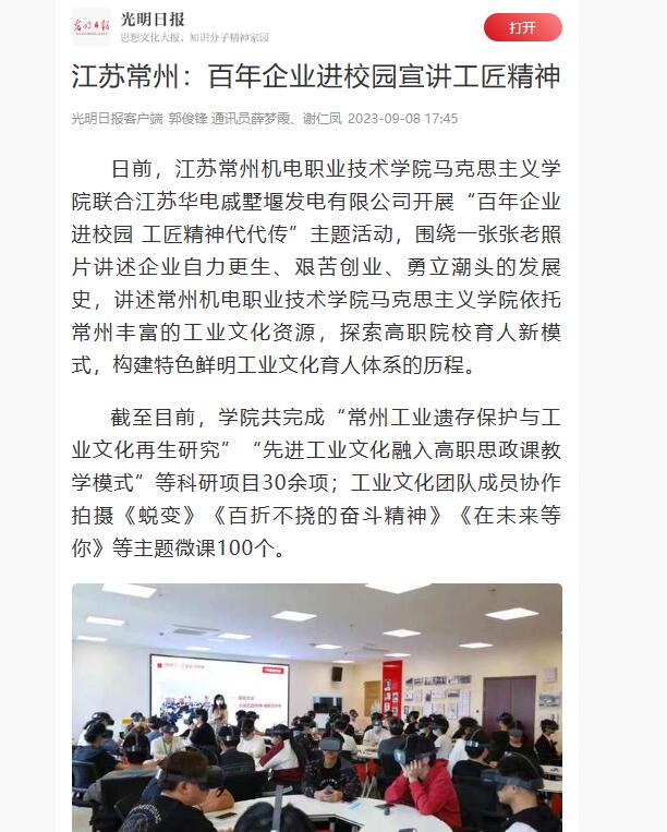 日前,江苏常州机电职业技术学院马克思主义学院联合江苏华电戚墅堰发电有限公司开展“百年企业进校园 工匠精神代代传”主题活动,围绕一张张老照片讲述企业自力更生、艰苦创业、勇立潮头的发展史,讲述常州机电职业技术学院马克思主义学院依托常州丰富的工业文化资源,探索高职院校育人新模式,构建特色鲜明工业文化育人体系的历程。