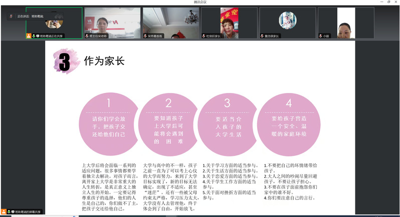在家长提问环节,学生和家长通过腾讯会议纷纷提问,问题主要聚焦在住宿、费用、饮食、学校设施、学校活动以及本专业的具体内容和学生提升等各个方面。对此,老师和班级助理都耐心地进行了回答。
