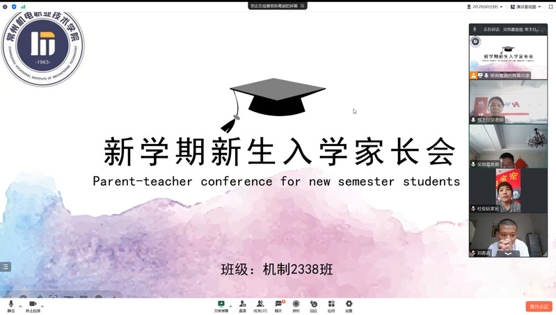 9月10日,机械工程学院举行了新一届中德SGAVE班新生家长视频会。机制2338中德SGAVE班的学生、家长、老师以及班级助理齐聚一堂,共同为新生的开学工作做好各项准备。会议由机制2338班班主任吴新平主持。