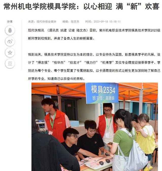 现代快报讯 (通讯员 姚建 记者 陆文杰)日前,常州机电职业技术学院模具技术学院2023级新同学到校报到,开启了各自人生的崭新篇章。