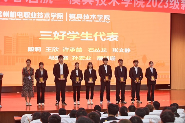 2023级钱俊峰作为新生代表发言,立志在今后的学习生活中,做好人生规划,不忘初心,以大国工匠为榜样,锻造技能。新生班主任代表孙晓燕博士从自己的求学经历讲起,希望同学们在大学里学好知识,树立远大目标,做好自己的职业规划。