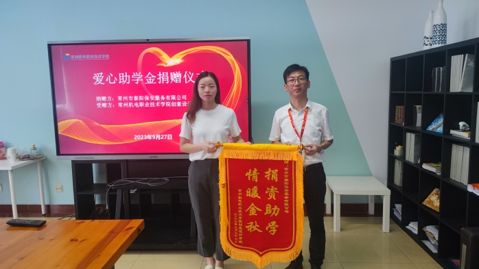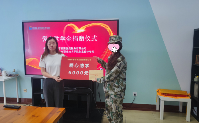 9月27日,企业爱心助学金捐赠仪式在创意设计学院会议室举行。常州市泰阳保安服务有限公司党支部书记颜百慧和科教城派出所徐于警官来到我校创意设计学院,给一名困难学子带来了6000元助学金,希望用爱心帮助其渡过难关。