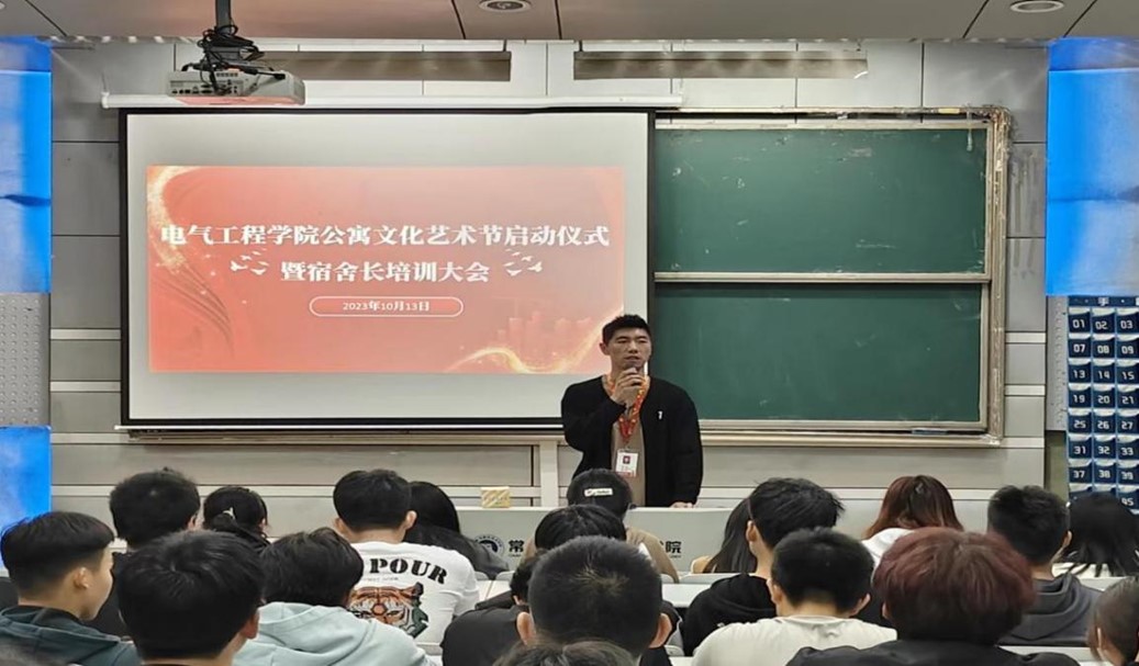 10月13日晚,电气工程学院公寓文化艺术节启动仪式暨宿舍长培训大会在西教学楼101举行,公寓辅导员宋宏科、高露、“一站式”学生社区综合服务中心全体学生干部、2023级各班级班长、生活委员、宿舍长等240余人参加会议。