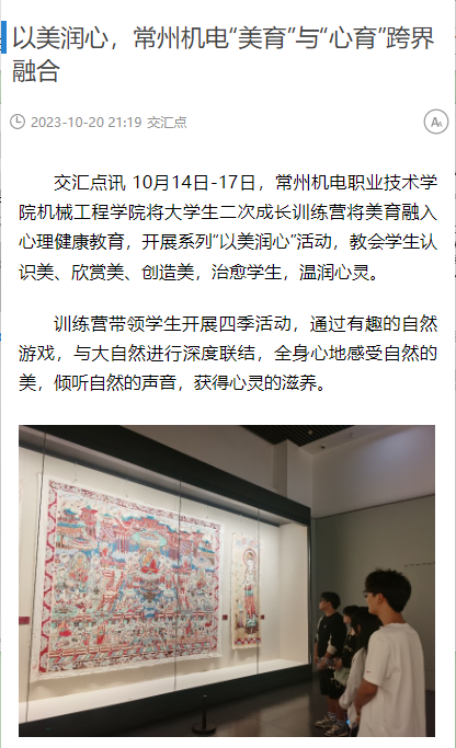 交汇点讯10月14日-17日,常州机电职业技术学院机械工程学院将大学生二次成长训练营将美育融入心理健康教育,开展系列“以美润心”活动,教会学生认识美、欣赏美创造美,治愈学生,温润心灵。
