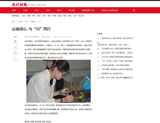 现代快报讯 为引导学生释放压力,正确认知自我,形成积极向上的“阳光”心态,日前常州机电学院模具技术学院举办“以画润心、与‘闪’同行”心理主题雨伞涂鸦活动。学生们在雨伞上涂鸦,用生动的笔触描绘了同学们成长的烦恼、日常生活的所思所感与各类常见心理问题,进而写下自己的心愿和情感,来释放内心的压力和情感,缓解学习和生活中的压力,并用自己的想法和情感来装饰它们,表达自己的内心世界。