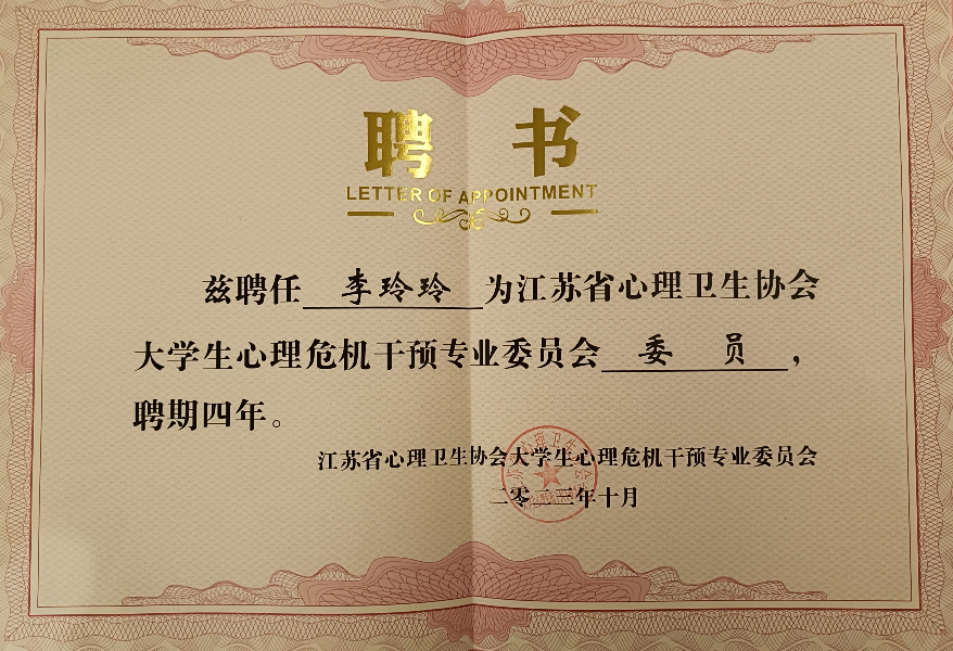 会中,江苏省心理卫生协会秘书长李箕君宣读换届批复文件,然后进行换届选举投票。我校心理中心主任李玲玲被聘为江苏省心理卫生协会大学生心理危机干预专业委员会委员,委员由心理咨询师、精神科医生和律师组成,李玲玲上台领取委任聘书。