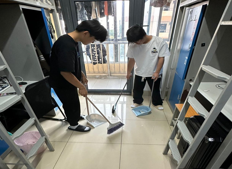 宿舍内,同学们集中对宿舍地面、床面、桌面、衣柜、卫生间等进行全面清扫,对个人内务进行全面整理,确保人人行动起来、内务整洁起来、宿舍干净起来。