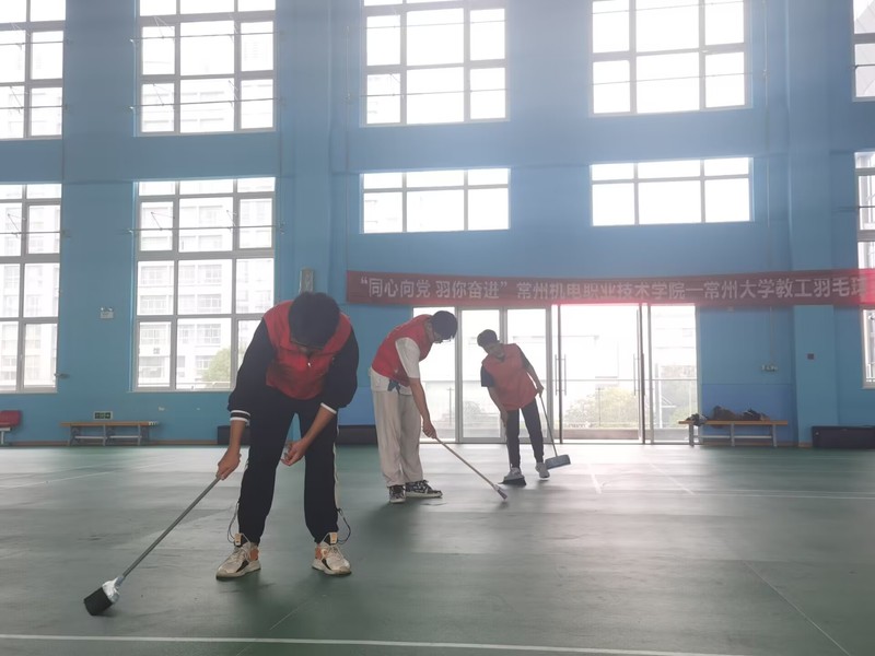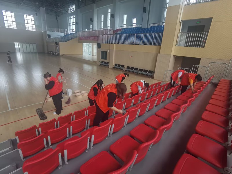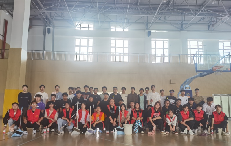 体育馆内,高鹏志愿者们热情高涨、摩拳擦掌、跃跃欲试。在学院老师的示范带领下,经过简单的分工协调,志愿者们手持扫把、簸箕、抹布等打扫工具,争先恐后地擦栏杆、清垃圾,默契配合,干劲十足。