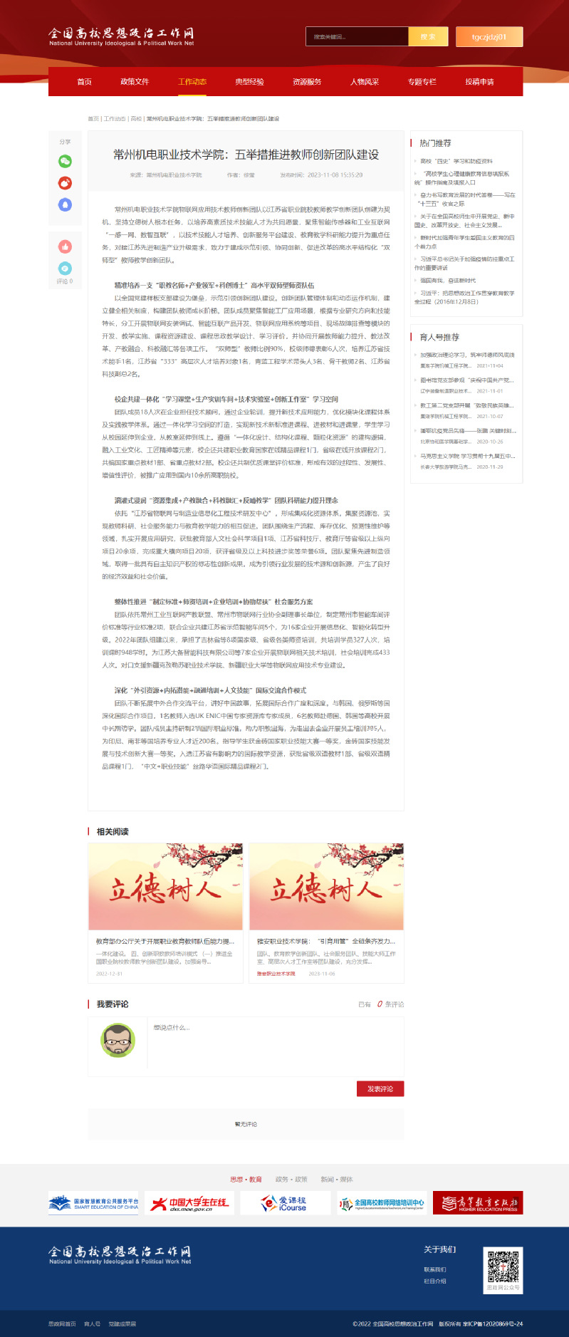 团队成员18人次在企业担任技术顾问,通过企业轮训,提升新技术应用能力,优化模块化课程体系及实践教学体系。通过一体化学习空间的打造,实现新技术新标准进课程、进教材和进课堂,学生学习从校园延伸到企业,从教室延伸到线上。遵循“一体化设计、结构化课程、颗粒化资源”的建构逻辑,融入工业文化、工匠精神等元素,校企还共建职业教育国家在线精品课程1门,省级在线开放课程2门,共编国家重点教材1部、省重点教材2部。校企还共制优质课堂评价标准,形成有效的过程性、发展性、增值性评价,被推广应用到国内10余所高职院校。