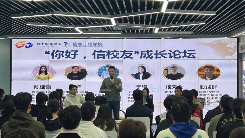 11月11日,正值我校60周年校庆之际,信息工程学院举行了树人讲坛之之“你好,信校友”成长论坛。本次论坛邀请了徐辉(2013级)、吴军龙(2007级)、于缙(1997级)、杨天金(2013级)、张成群(2015级)等五位校友参加,论坛由陈延雪(2013级,现为学院软件团队教师)主持,50余名在校学生参加。