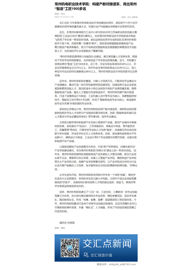 “常州机电职院围绕助力技能型社会建设,建立高质量人才培养体系,既推动了学校专业特色群建设,也同样促进了学生就业的高质量。迄今,学院累计培育出常州“智造”工匠1900多名,近三年,毕业生就业率保持在98%以上,毕业生苏锡常就业占比70%以上,其中毕业生常州地区就业占比50%以上,用人单位对毕业生的综合满意度达96%以上。”常州机电职业技术学院党委书记沈琳说道。