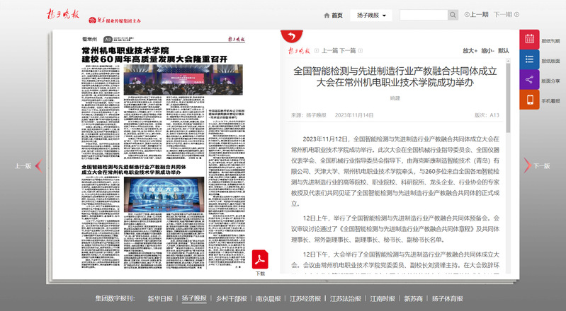 2023年11月12日,全国智能检测与先进制造行业产教融合共同体成立大会在常州机电职业技术学院成功举行。此次大会在全国机械行业指导委员会、全国仪器仪表学会、全国机械行业指导委员会指导下,由海克斯康制造智能技术(青岛)有限公司、天津大学、常州机电职业技术学院牵头,与260多位来自全国各地智能检测与先进制造行业的高等院校、职业院校、科研院所、龙头企业、行业协会的专家教授及代表们共同见证了全国智能检测与先进制造行业产教融合共同体的正式成立。