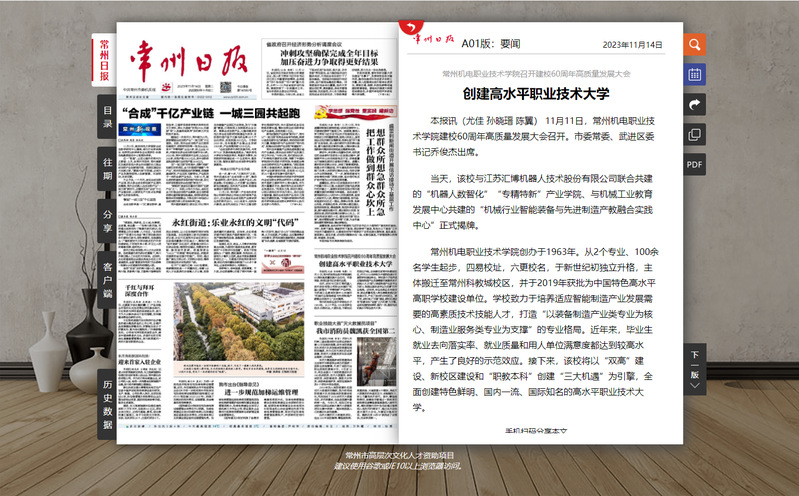 常州机电职业技术学院创办于1963年。从2个专业、100余名学生起步,四易校址,六更校名,于新世纪初独立升格,主体搬迁至常州科教城校区,并于2019年获批为中国特色高水平高职学校建设单位。学校致力于培养适应智能制造产业发展需要的高素质技术技能人才,打造“以装备制造产业类专业为核心、制造业服务类专业为支撑”的专业格局。近年来,毕业生就业去向落实率、就业质量和用人单位满意度都达到较高水平,产生了良好的示范效应。接下来,该校将以“双高”建设、新校区建设和“职教本科”创建“三大机遇”为引擎,全面创建特色鲜明、国内一流、国际知名的高水平职业技术大学。