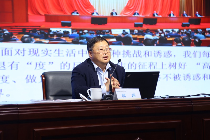 会上,蒋超结合违纪违法典型案例,作了《高线•中线•底线——“党员干部锤炼党性修养,坚持廉洁从政”的认识体会》专题讲座,对全体党员干部提出了三点希望,即一要树好信仰的“高线”,用初心使命熔铸信仰高线、以“党史”为鉴筑牢信仰高线、靠学思悟践夯实信仰高线;二要夯实道德的“中线”,修忠诚之德、修正派之德、修奉献之德;三要守住清廉的“底线”,要坚守纪律规矩、要坚决秉公用权、要坚持清勤合一,真正做到无愧于党、无愧于民、无愧于心。
