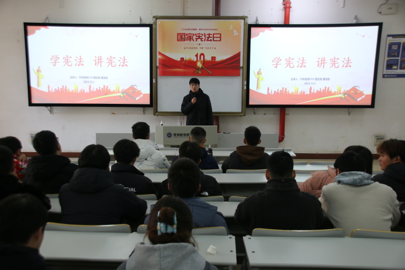 一堂团课,一个案例。汽车检测2351团支部黄汤浩带来《我国宪法的演变与发展》主题团课,深刻领会宪法的权威地位和发展历程。2022级汽车检测团支部康宇飞通过分析“制作表情包”等身边违法案例,警示同学们违法就在身边,宪法与个人生活息息相关。
