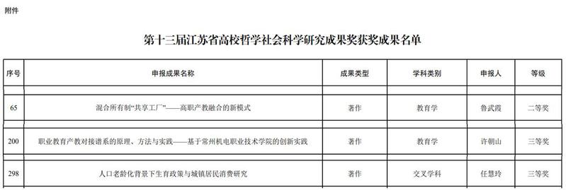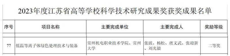 近日,江苏省教育厅公布了2023年度高等学校科学技术研究成果奖和高校哲学社会科学研究成果奖获奖名单。我校《低温等离子体绿色处理技术与装备》(主持:张波)获得科学技术研究成果奖二等奖;《混合所有制“共享工厂”——高职产教融合的新模式》(主持:鲁武霞)获得哲学社会科学研究成果奖二等奖,《职业教育产教对接谱系的原理、方法与实践——基于常州机电职业技术学院的创新实践》(主持:许朝山)和《人口老龄化背景下生育政策与城镇居民消费研究》(主持:任慧玲)的论著分别获三等奖。