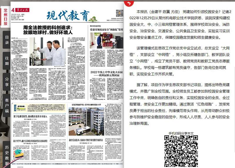 常报新媒体讯(金建平 陈翼 尤佳)党建如何引领校园安全?记者29日从常州机电职业技术学院获悉,该院探索构建校园安全大、中、小三级网格管理体系,围绕学校政治安全、消防安全、治安安全、交通安全、公共食品卫生安全、实验实习实训安全等安全重点工作,保障校园稳定发展和师生健康安全。