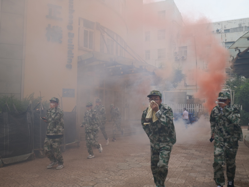 下午演练现场,一站式社区公寓楼内突然浓烟滚滚,警报突然响起。学生们迅速进入紧急状态,在老师的指导下,用湿毛巾捂住口鼻,低姿前行,按照预定路线快速、有序地从宿舍楼撤离到安全地带。整个逃生过程紧张而有序,全体学生均在规定时间内完成了疏散。