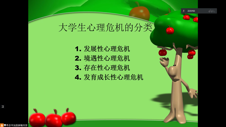 许老师主要从以下四个方面进行了详细阐述:一是当前大学生心理现状:疫情呈现多点散发,特别是上海疫情的突然爆发,高校长时间的封校、发热隔离以及线下网课等,学生心理压力增大,大学生心理问题明显增多;二是心理危机的内涵:即个体或者群体在面临突然或重大生活事件时,认为凭借自身的能力和拥有的资源无法解决问题而产生的一种心理严重失衡状态。三是大学生心理危机的分类:发展性心理危机、境遇性心理危机、存在性心理危机、发育成长性心理危机;四是大学生心理危机的防范措施:建立理性认、掌握艾利斯ABC理论、学会合理的宣泄方式(转移注意力、交几个知心朋友、咨询心理老师)、学习以积极的眼光看问题等。