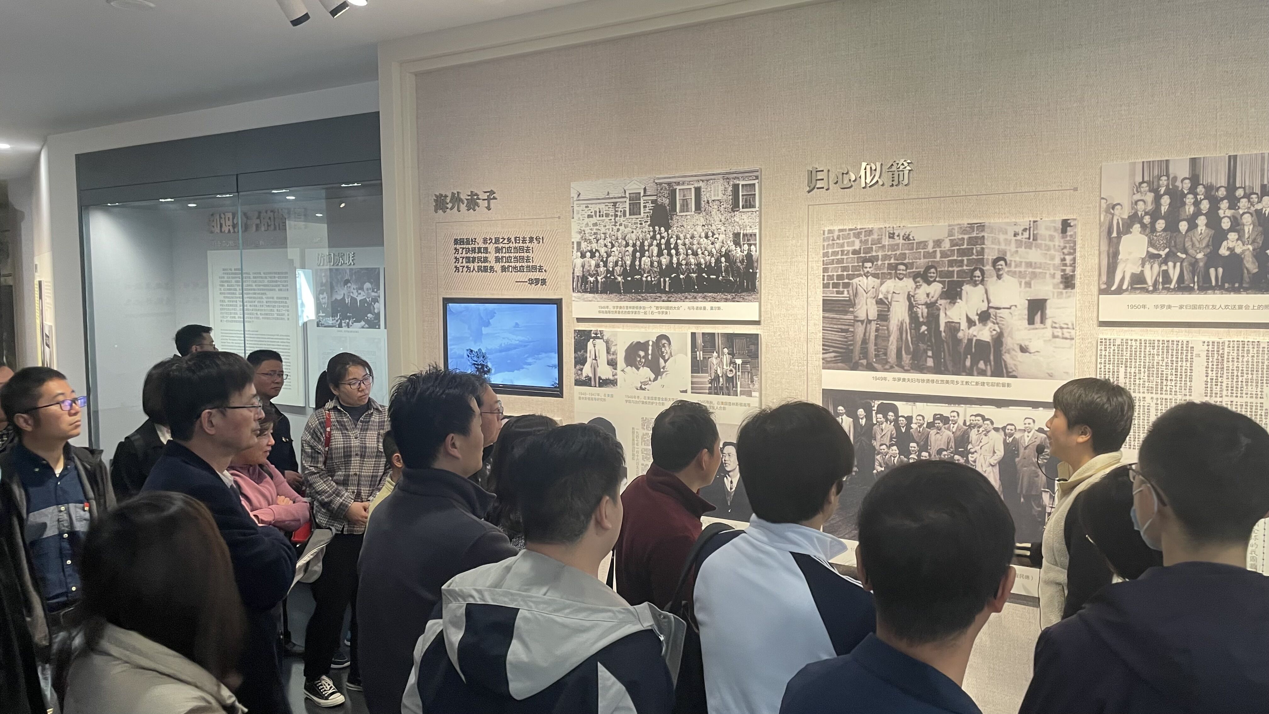 华罗庚纪念馆是一座建筑面积为2050平方米、展厅呈圆形的现代纪念性建筑,外部墙体向四面延伸构成类似直角坐标系,象征华老立足圆心多方发展的科学精神。进入华罗庚纪念馆后,跟随着讲解员的步伐,同志们深入地了解了华老的一生,挑灯夜读、自学课程、海外求学、情系家国,他奋力拼搏、自学成材的毅力和献身科学事业、为人民服务的爱国精神令所有同志心生崇敬。纪念馆中一张张图片,一件件文物都在诉说着华老的事迹,展示了他的生命轨迹,反映出华老一生的事业与追求。