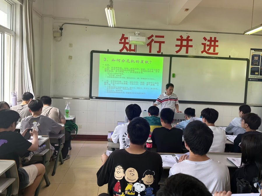 许老师主要从三个方面进行了详细的讲述:一是心理危机及对人成长的意义;心理危机的定义(面临突然或重大生活事件,个体既不能回避又无法用常用的方法来解决问题时所出现的心理失衡状态)、心理危机的影响因素、心理危机的主要原因、心理危机的结果等;二是心理危机的识别:心理异常的原因分析(学习生活压力过大、个人感情受挫、人际关系失调等)、危机风险因素按频次排序结果、如何分危机的星级、危机案例、常见精神障碍、我们的认识误区;三是心理危机的预防与干预:预防及危机干预、干预中的交流技术(积极倾听、共情、真诚,建立良好的关系)、心理治疗、推荐影视、建立预警机制、心理危机预警对象、高危人群及干预措施、如何正确看待心理、精神疾病、五级心理危机评估体系、心理危机处理流程等。生动的身边案例,丰富的心理健康知识,灵活的现场互动深深吸引了同学们的注意力,也让大家在愉悦的氛围中学习了心理健康知识。