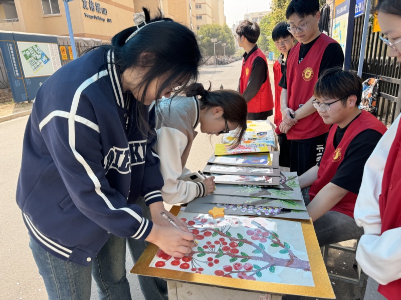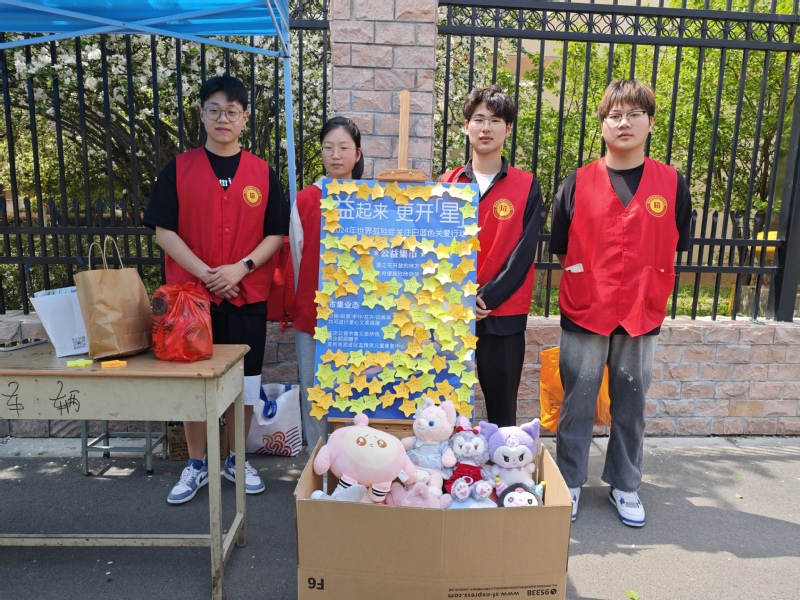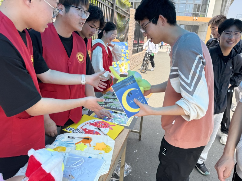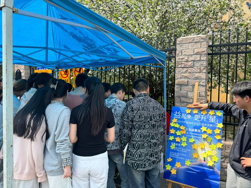 “天天开心,健康成长”“愿每颗星星都被温柔以待,健康成长……”4月1日中午,志愿者为孩子们搭建了临时公益义卖点,吸引了很多同学驻足。在志愿者们介绍了“来自星星的孩子”后,同学们争先恐后地在爱心留言板上写下了对他们的祝福。义卖摊位展出的孩子们的艺术作品也受到了同学们的喜爱,他们通过捐献玩偶、捐赠书籍、爱心捐款等方式,交换孩子们的画作,以物品为载体,向星星的孩子们传达祝福、关爱和陪伴。短短一个小时,便已收到玩偶捐赠百余个,书籍十余本,捐款四百多元,前来捐赠的同学仍然络绎不绝。