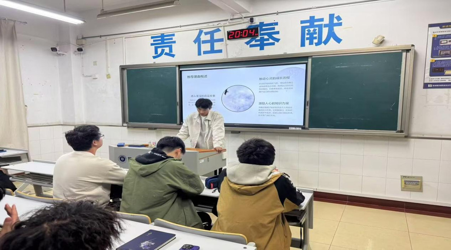 活动伊始,主讲人明思成介绍了《你当像鸟飞往你的山》一书。他带着情感分享了书中的革命故事。他将书中的剧情以第一人称视角进行了绘声绘色的讲述,令同学们重温了那段难忘的红色记忆。现场交流热烈,气氛活跃。