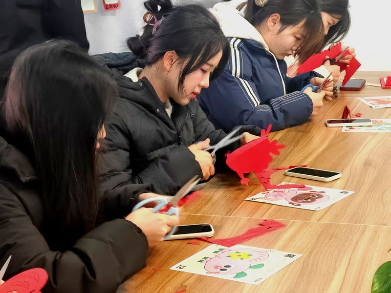 活动在剪纸艺术背后的民俗故事中拉开序幕,从传统婚俗的“喜”字剪纸,到新年祈愿的“连年有余”,学长们细致地为同学们讲述这些民俗故事所蕴含的美好寓意,让同学们对剪纸艺术所承载的深厚文化内涵有了更为清晰直观的认识。在实际动手操作环节,同学们拿起剪刀和彩纸,在交流与分享过程中,彼此协作小心翼翼地进行裁剪,一幅幅各具特色的剪纸作品逐渐呈现出来,寄托着大家对新一年的美好期许。