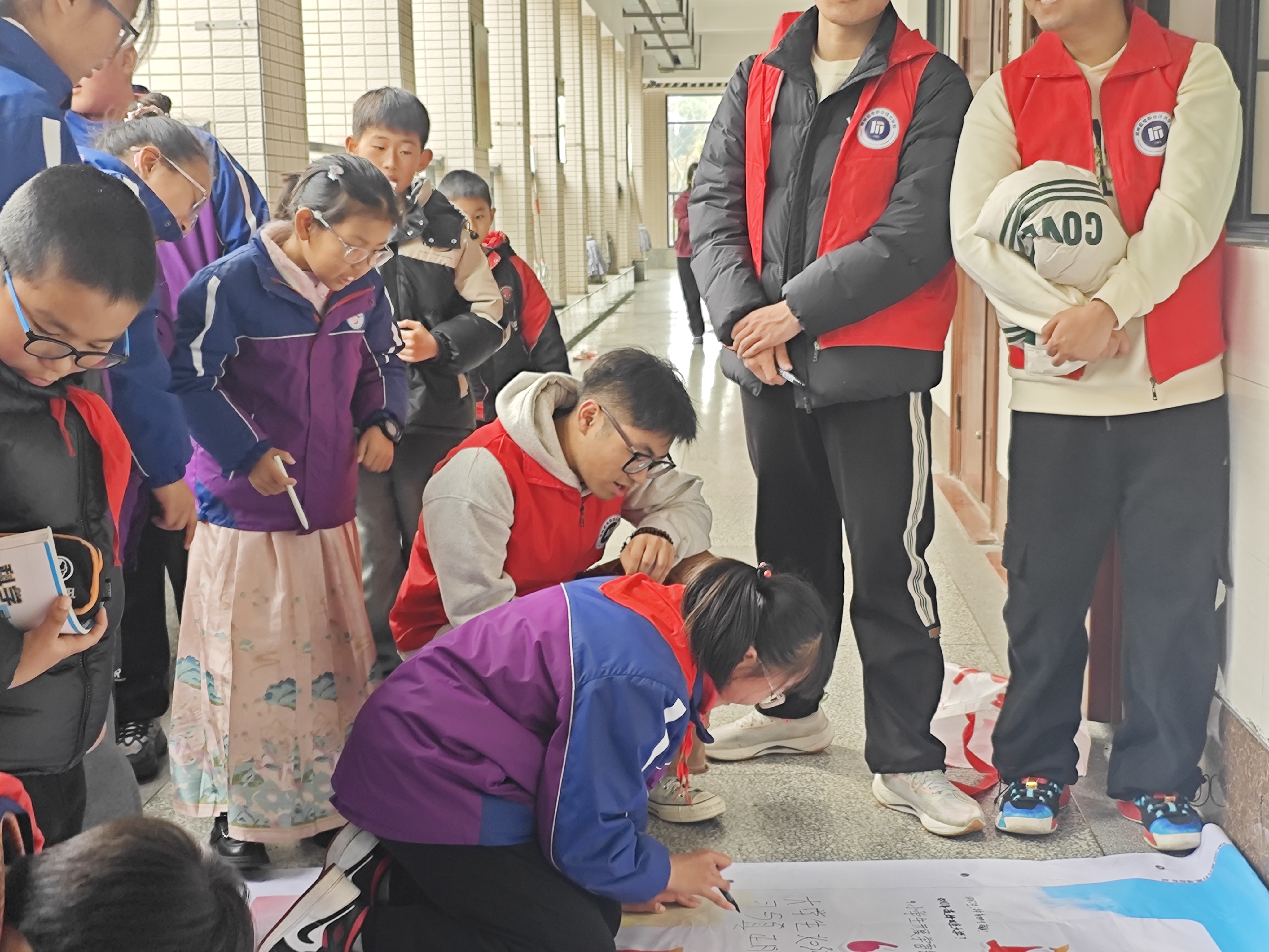 3月10日,在鸣凰中心小学,志愿者携带着寓意深刻的喷绘布,引领孩子们走进雷锋精神的世界。在这块充满教育意义的问答墙上,孩子们用稚嫩的文字记录下对雷锋精神的探寻和对大学生活的好奇。由此,一场跨越时空的追“锋”对话缓缓展开。在校内,志愿者也积极开展摊宣活动,激发广大大学生在线互动,传承雷锋精神。