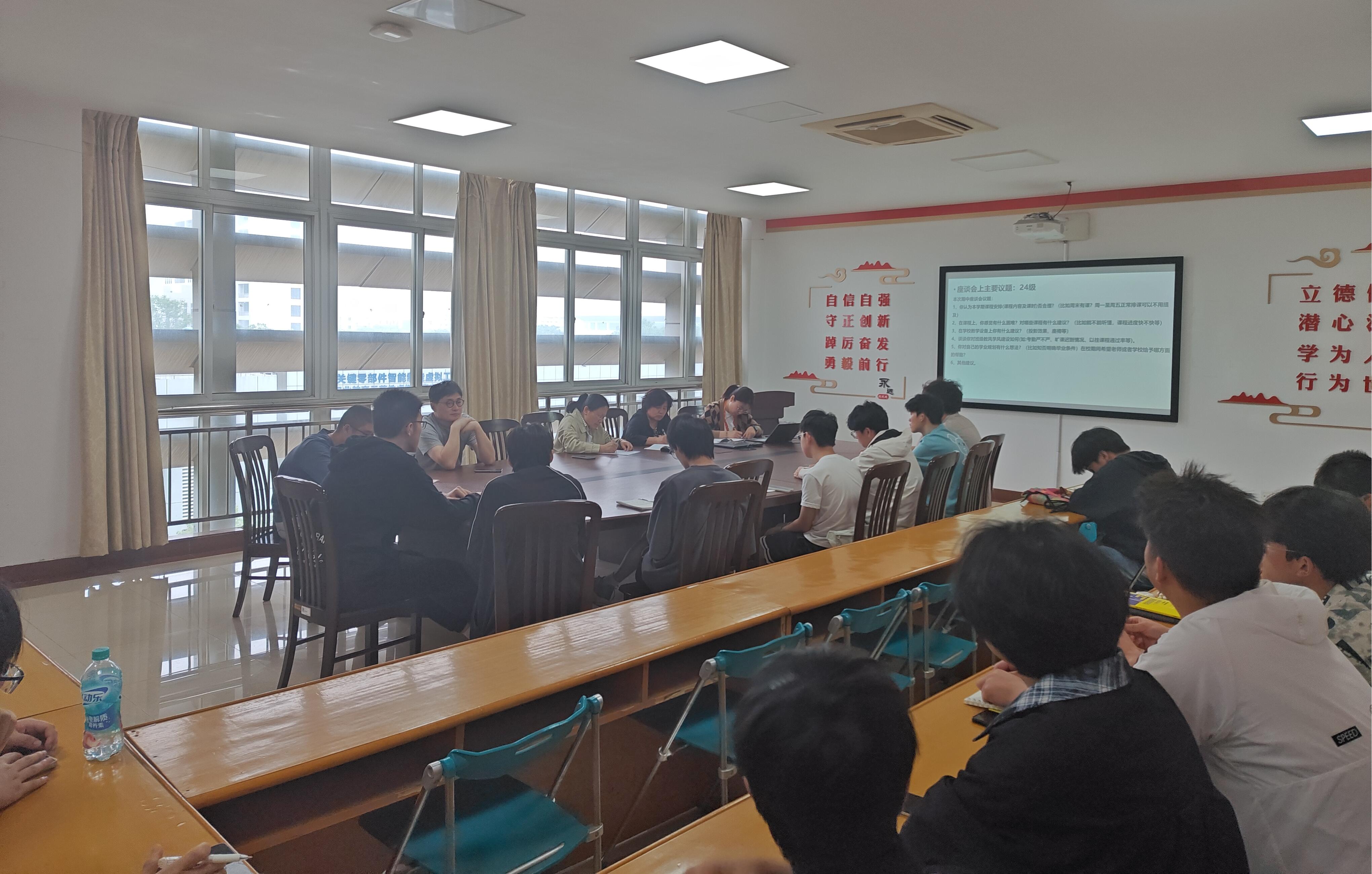 4月21日,交通工程学院在善为楼421会议室召开本学期期中学生座谈会。一级督导高芳、二级督导卞荣花、团队主任郑利锋、张东辉、教学秘书闫培梅和各班信息员参加了座谈会。