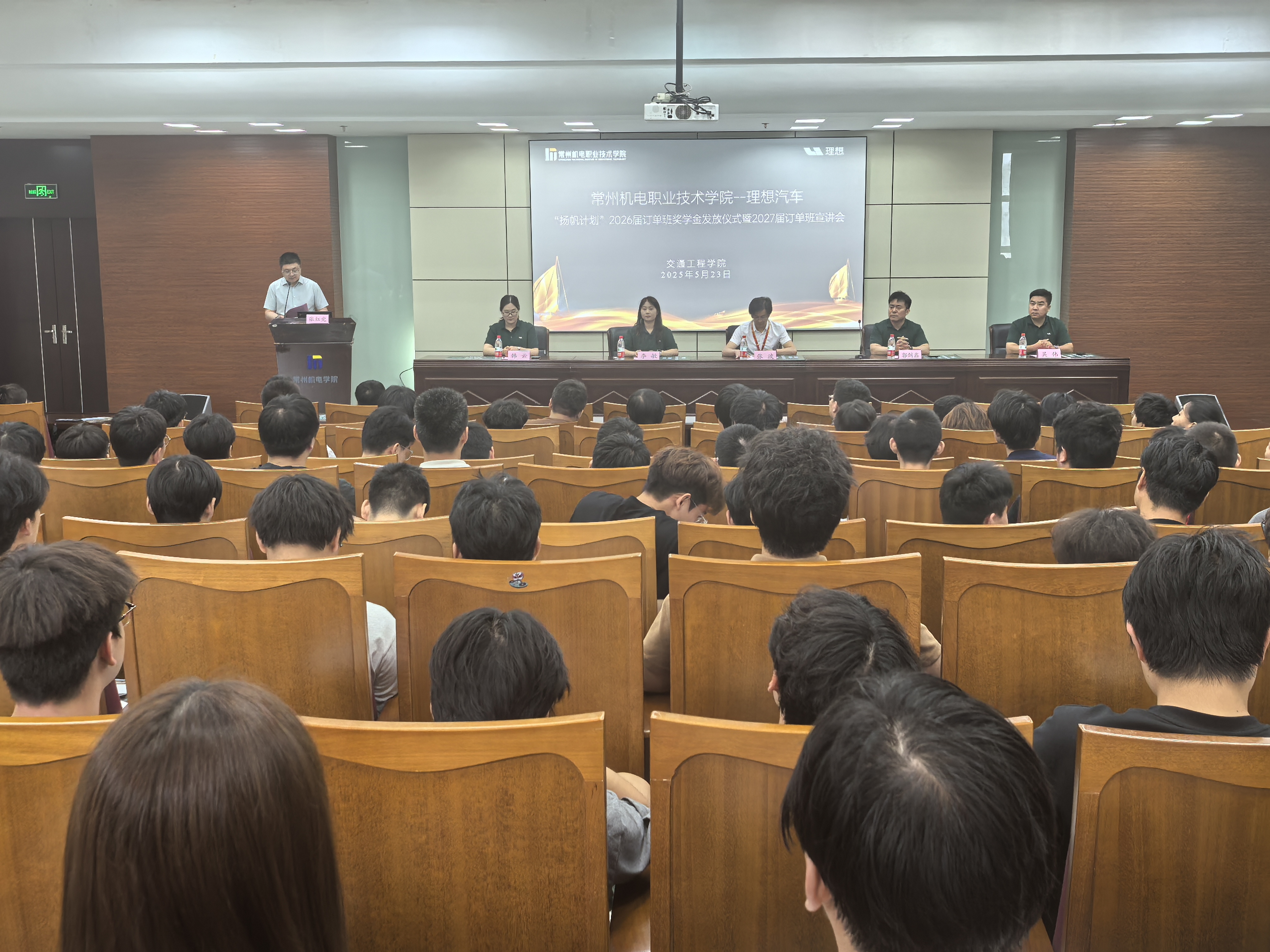 5月23日,交通工程学院举行了理想汽车“扬帆计划”2026届订单班奖学金发放仪式暨2027届订单班宣讲会。理想汽车校企合作项目负责人郭剑鑫、江苏省培训主管吴慧玲、扬州邗江服务店长韩云、常州武进服务店长吴伟,交通工程学院院长张波、副书记沈俊、副院长王峰、全体项目教师,2026届“扬帆计划”售后订单班学员以及2024级相关专业同学参加本次活动。